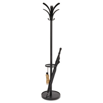 Free-standing metal Coat Rack features four double hooks to securely hold up to eight garments. Steel ball tip hooks help protect garments. Ship Class Code: F Special Features: With Umbrella Stand--Bottom water receptacle. Total Recycled Content Percent: 0% Post-Consumer Recycled Content Percent: 0% Pre-Consumer...